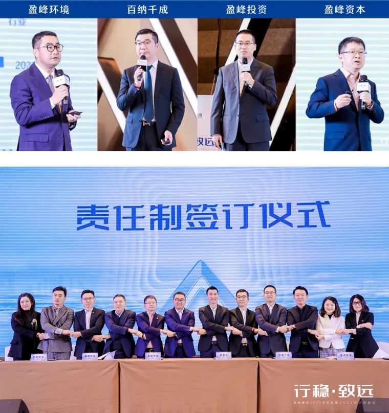 盈峰環境、百納千成、盈峰資管則分別結合集團五年戰略規劃,就2022年的經營成果、2023年的戰略目標進行了匯報,從反思問題出發,力求實現既定目標,助力集團高質量發展。隨后,各成員單位負責人與集團董事長、總裁何劍鋒簽訂2023年責任制目標,并與集團相關領導一起進行宣誓。各位帶頭人斗志昂揚,滿懷信心,承諾以穩中求進的精神,共創美好未來。